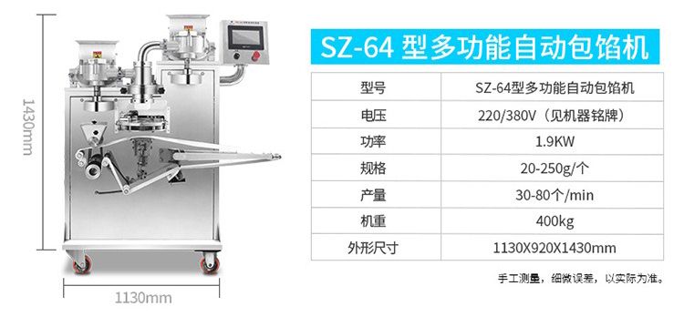 SZ-65型多功能自動包餡機(jī)采用臥式輸面、立式輸餡系統(tǒng),運(yùn)行流暢,效率高。可生產(chǎn)豆沙、蓮蓉、五仁餡等較干餡料的包餡類產(chǎn)品,制出的產(chǎn)品餡、皮比例可任意調(diào)整,制品大小統(tǒng)一,外形美觀。